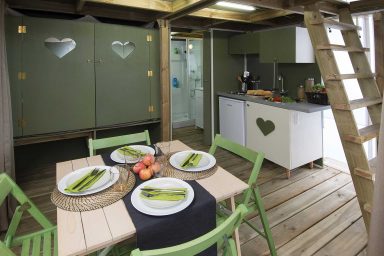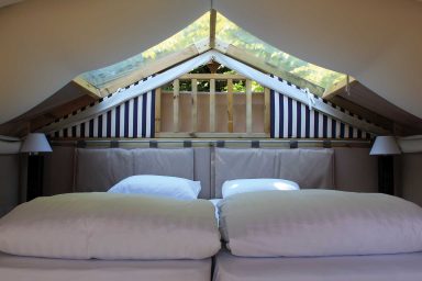 Air lodge è una tenda a due piani, incantevole nei suoi colori che ricordano la terra, unica nei suoi materiali naturali e delicati. Il piano terra è costituito da una piccola area living, angolo cottura con 2 piastre e lavello. Due porticine a battente nascondono un letto matrimoniale, e nella parte posteriore della tenda c’è spazio per un piccolo bagno con box doccia e lavabo. Una piccola scaletta in legno conduce al piano primo: un’ampia e luminosa camera matrimoniale. Il tetto è dotato di grandi finestre oscurabili e quando le pareti frontali della stanza sono completamente aperte, un piccolo balconcino permette di affacciarsi e godersi la vista di tutto ciò che circonda la tenda. Air lodge: una totale immersione nella natura ed una vista privilegiata direttamente dalla vostra stanza.