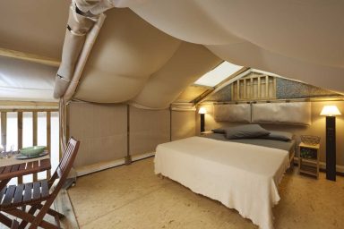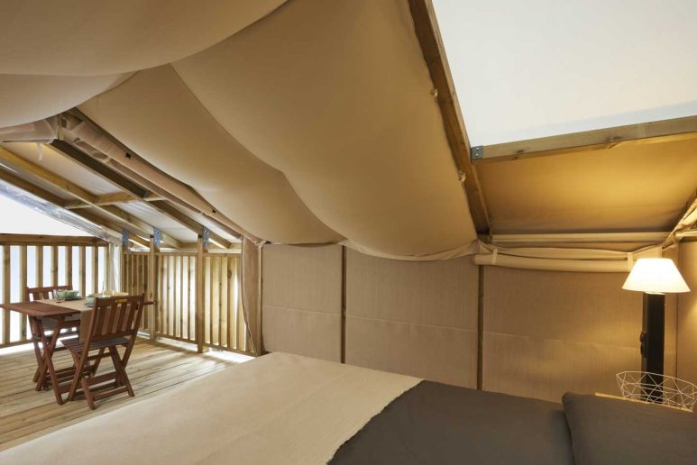 AIR 2.0 is a subtle blend of the traditional two-story AIR tent, with a more modern style and design, which combines more space for the living room and kitchenette, expanded, to offer greater living comfort, the bathroom with shower and sink and a bed for two. The signature suite on the top floor with a view of the stars and a spacious balcony. The balcony aims to bring the environment closer to the upper living space and offer a privileged panoramic spot. The AIR 2.0 tent combines luxury and style with glamping designs to present a unique holiday accommodation.