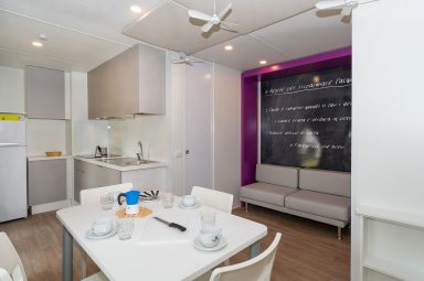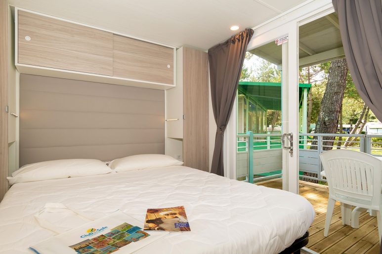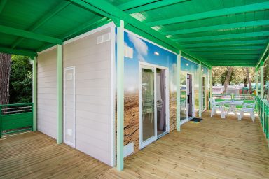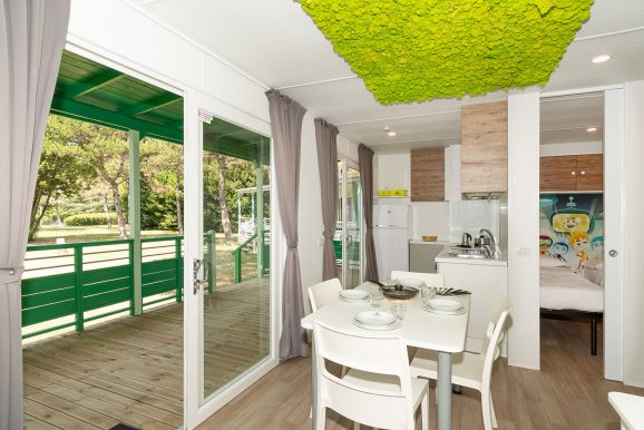 Meteo Home is equipped with a touchscreen control system, air conditioning system, induction hob, TV, and state-of-the-art accessories, and is extremely cosy thanks to the fine interiors. The two Meteo Homes at the Camping Village Marina Julia in Monfalcone can house up to 5 people, and consist of 2 bedrooms, 2 bathrooms, a living room, and a veranda. Their colours and design are inspired by Earth and Air, respectively. They stand out for the colours and materials used. The ceiling of the Earth Meteo Home is made of natural moss, whereas the Air one is provided with small ceiling fans, which ensure unique aesthetic impact.