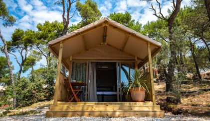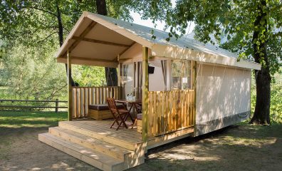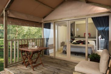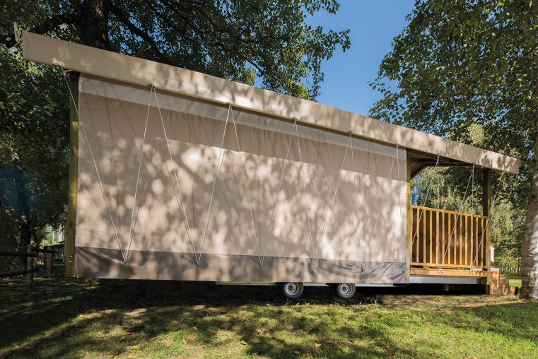 Mini [S]-[SR] Lodge is the updated version of Mini Lodge. Now is truly special, with the addition of a private bathroom, complete with shower and restroom services. The single storey tent contains an elegant room connected to a veranda, for direct contact with nature.