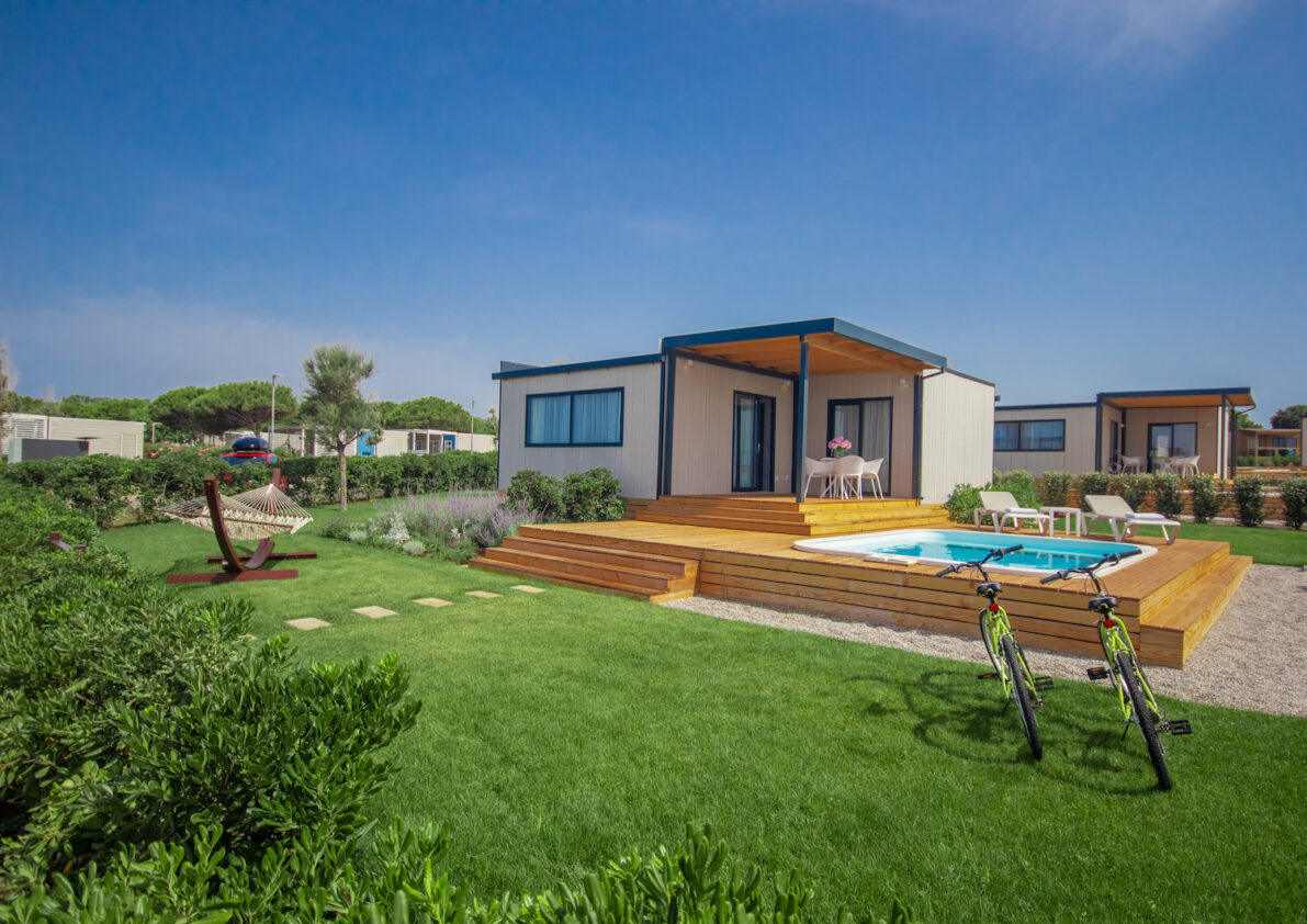 Rispetto al modello di allestimento tradizionale, qui l’ospite ha a disposizione circa 300mq di spazio esterno: significa che la mobile home che ha già una metratura superiore allo standard di circa 15mq, è circondata da un giardino privato e da una piscina personale di 12x12mq, il tutto recintato e non accessibile da esterni. Uno spazio molto generoso e unico nell’offerta open air.