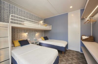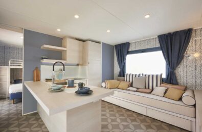 La mobile home ispirata alle più belle espressioni mediterranee nelle quali dominano i colori e i materiali naturali della terra e del blu mare. In questo caso si è puntato su interni di stile pulito e minimale combinato a elementi decorativi caratteristici: effetto ceramica delle pavimentazioni, pareti con dominio cromatico di bianco, azzurro e blu, sia per tessuti sia per i dettagli. Nuovi infissi in alluminio anodizzato, che godono di una superficie luce molto ampia e di un telaio sottile e robusto per non interrompere il dialogo interno/esterno.